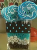 Here's a small example of what I did for my sister's baby shower. More pics to come soon. Basically I had many glass jars all filled with blue, white, and brown candies and matching ribbon around them for the guests to take and fill a bag full of candy as they were leaving for a favor. It was a hit! This picture only shows one of the many glass containers filled with goodies!